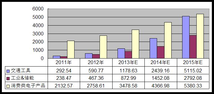 在這個市場,鋰離子電池需求的增長主要來自于兩方面:一是產品本身的智能升級對電池用量的需求在增長;二是新產品產生了新的市場需求。對于傳統功能手機,可能700mAh的電池就足夠了,但對于智能手機,2000mAh都顯得不夠。至于后者,突出的例子是平板電腦產品自2010年推出以來,到2012年迅速取得了1.3億臺的年銷量,為智能手機、平板電腦等充電的移動電源產品市場2012年極其火爆,銷量達到了驚人的100多萬kWh,是2011年的數倍。