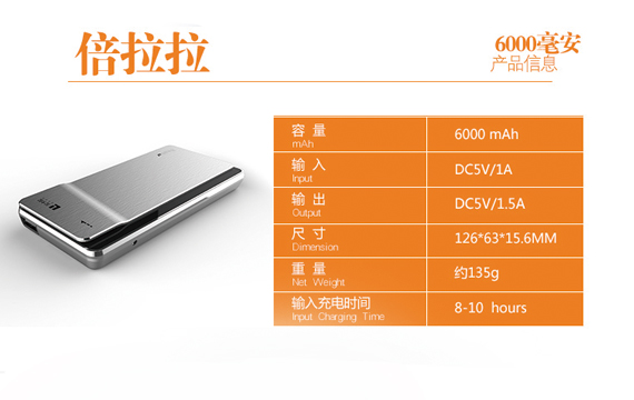 高性能聚合物鋰電芯,鑄就高品質移動電源。6000毫安充足容量,隨時隨地為你的手機充電,確保您的信息流永遠暢通,確保你的精彩人生永不斷電。