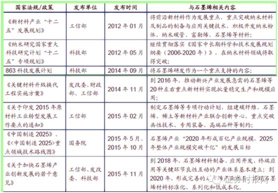 《中國制造2025》明確了石墨烯發展目標,文件指出到2020年“規模制備及電化學儲能、印刷電子、航空航天用輕質高強復合材料、海洋工程防腐等應用領域的技術水平達國際領先,大幅提升相關產品性能,形成百億元產業規模。到2025 年突破石墨烯在電子信息領域應用的技術瓶頸,整體產業規模突破千億。”