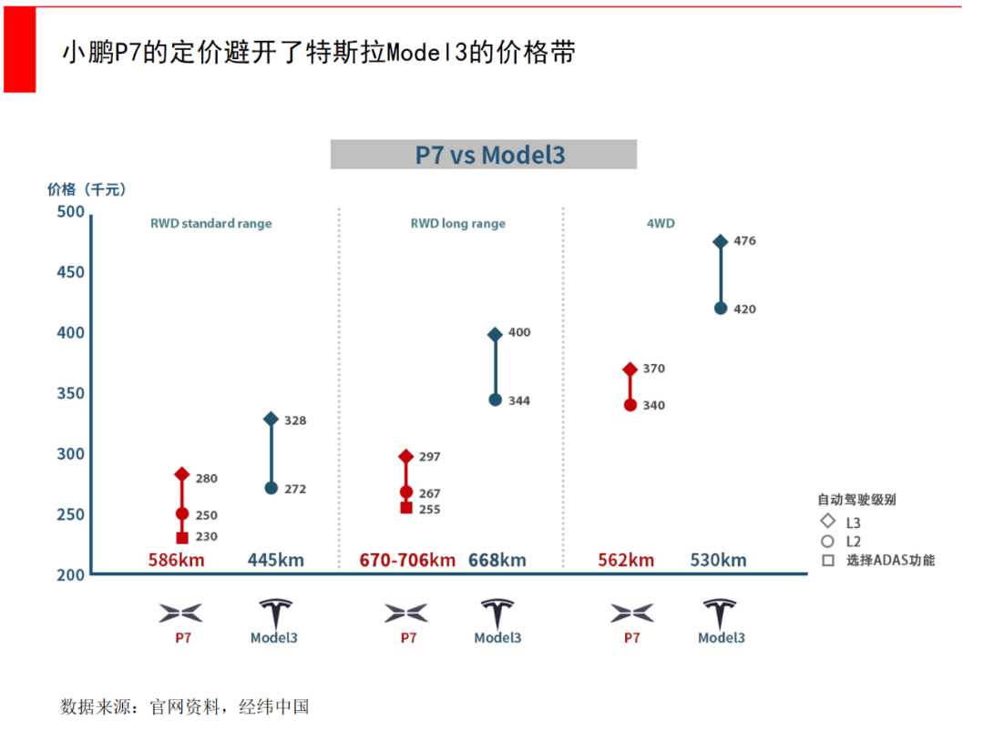 小鵬的定位就是這么清晰,它可能并不奢華,但針對的就是高性價比市場,它的定價整體低于特斯拉、蔚來和理想,產品力體現在續航和智能上,P7是目前