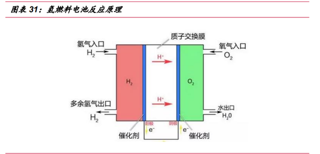 氫燃料電池原理是氫與氧結合生成水的同時將化學能轉化為電能和熱能,該過程 不受卡諾循環效應的限制,理論效率可達 90%以上,具有很高的理論經濟性。氫氣 進入燃料電池的陽極,在催 化劑的作用下分解成氫離子和電子。隨后,氫離子穿過 隔膜到達陰極,在催 化劑作用下與氧氣結合生成水,電子則通過外部電路向陰極移 動形成電流。不同于鉛酸、鋰電等儲能電池,燃料電池類似于“發電機”,且整個過程 不存在機械傳動部件,沒有噪聲和污染物排放。