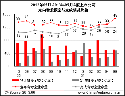 圖1 2012年05月-2013年05月A股上市公司定向增發(fā)預(yù)案與完成情況比較