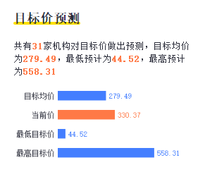 而在老虎證券上,可見有31家機構給出了目標價,最高目標價為558.31美元,最低目標價為44.52美元,相差10倍之多。