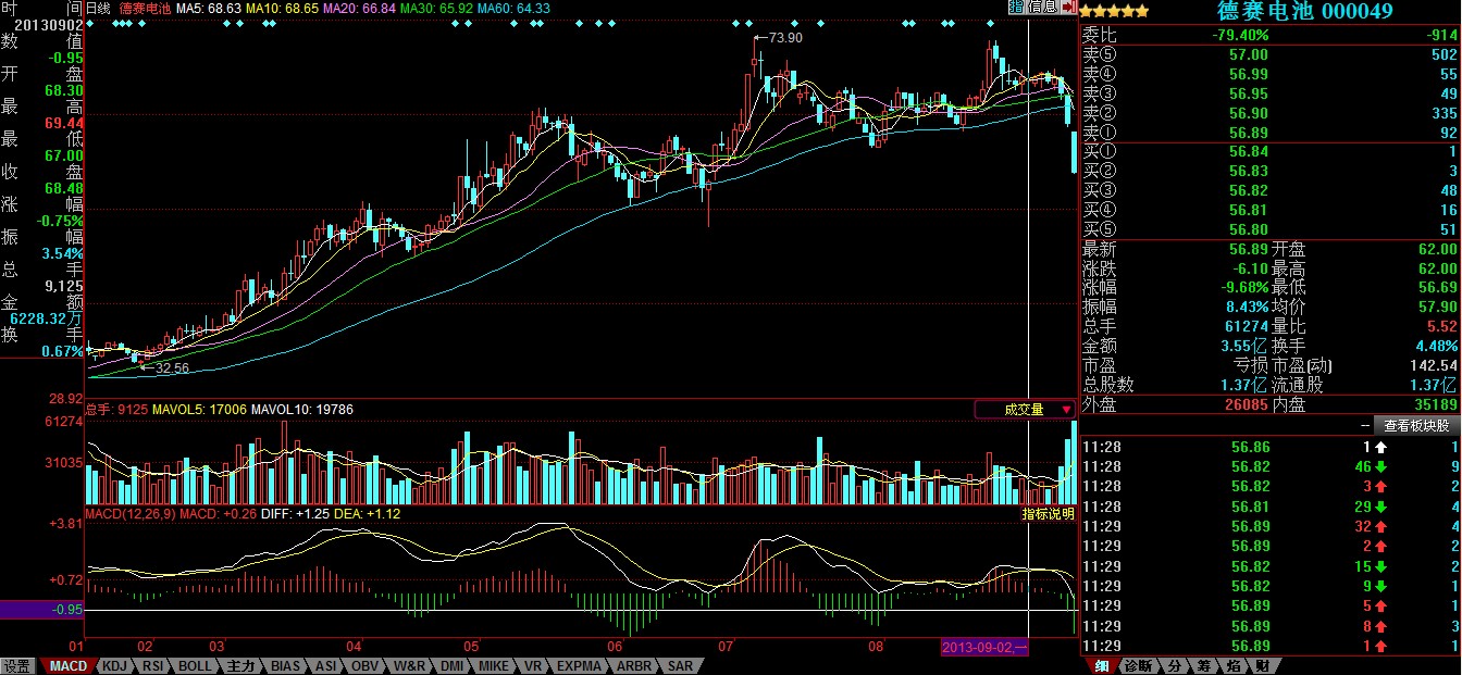 中國電池雜志-中國電池網(wǎng)9月11日訊(肖何 北京報(bào)道 ) 受綜合利空消息影響,德賽電池(000049)11日早盤一路狂瀉到跌停,午盤收在56.89元,下挫9.68%。按照流通股本1.3679億股計(jì)算,9月9日-11日上