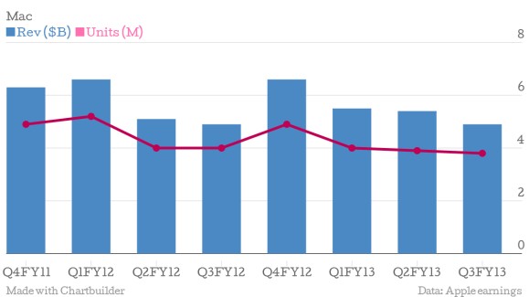 個人電腦產(chǎn)業(yè)的衰落導(dǎo)致人們產(chǎn)生一種錯覺,那就是在計算機銷售方面蘋果與其他企業(yè)相比似乎是個例外,但統(tǒng)計數(shù)據(jù)表明事實并非如此。實際上,Mac銷量與去年同期相比已下滑近10%,并且最近一個季度的銷量同兩年前銷售最佳的那個季度相比下滑幅度高達27%。造成這種現(xiàn)狀的原因之一便是蘋果自己的平板電腦對個人電腦市場的沖擊,但另一部分原因則是Mac設(shè)計更新沒有跟上,在某些關(guān)鍵細分市場沒有競爭力。從另外一個角度來看,即便是在兩年前,Mac部門在蘋果公司業(yè)務(wù)中還占據(jù)22%的份額,而在最近一個季度,僅占14%,還曾在上一假日購物季跌破10%。實際上,根據(jù)統(tǒng)計數(shù)據(jù),個人電腦市場年銷量仍有3億臺,假如蘋果公司能夠找到方法抓住這一機遇,顯然還存在成長機會。