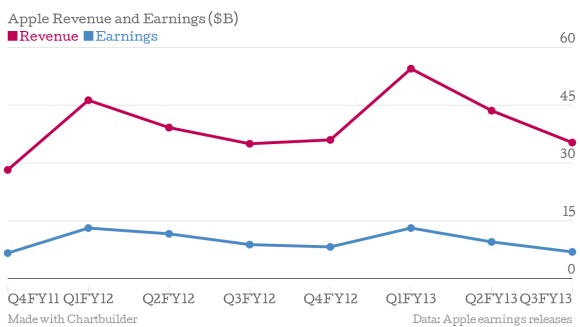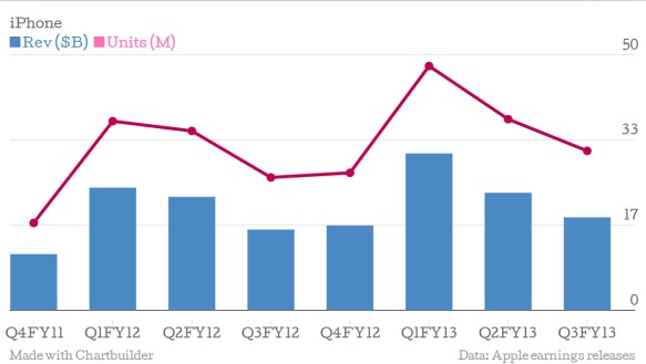 蘋果公司將在兩周內(nèi)發(fā)布第四財季收益報告。因iPhone新品上市后表現(xiàn)強勁,蘋果預(yù)計該季營收或?qū)⒂|及該公司三個月前公布的營收指引上限。然而,即便是超過370億美元的預(yù)期目標,也不過與去年同期持平而已。作為曾極有抱負的一家企業(yè),蘋果在2010到2011年間,其營收增長高達65%,去年也達到45%。目前,該公司剛結(jié)束兩位數(shù)的財年總增長,跌至個位數(shù)。盡管蘋果仍然賺錢,但其盈利將低于去年。以下5個圖表從蘋果公司主要業(yè)務(wù)方面分析為何這家企業(yè)會每況愈下。