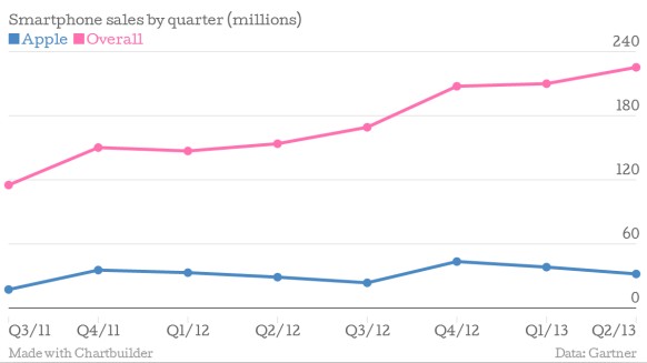 總的來說,智能手機市場增長驚人,在過去兩年里幾乎翻一番。雖然iPhone仍然流行,但整個市場季度出貨量從1.15億部提高到2.25億部,幾乎翻了一番。不像蘋果的起止圖受產(chǎn)品年度周期影響出現(xiàn)下降,智能手機整體市場并不存在周期性下滑。最終的結(jié)果是,蘋果的市場份額在20%上下波動,并曾在某一季度的基礎(chǔ)上下降到低至百分之十幾。