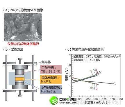 不僅是正極材料的開(kāi)發(fā),鈉離子充電電池的研究范圍在不斷擴(kuò)大。在本屆電池研討會(huì)上,因采用鋰離子的全固體電池研究而聞名的大阪府立大學(xué)發(fā)布了鈉離子全固體電池的研究成果注3)。固體電解質(zhì)采用鈉離子導(dǎo)電率為10-4S/cm的Na3PS4。在該固體電解質(zhì)的基礎(chǔ)之上采用鈦硫(TiS)正極和鈉錫(Na-Sn)合金負(fù)極的全固體電池在室溫下使用時(shí),雖然首次的不可逆容量較高,但第二次以后就可以穩(wěn)定地反復(fù)充電了(圖8)。