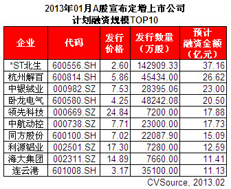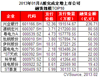 表1 2013年01月A股完成定增上市公司融資規模TOP10