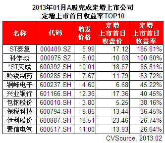 表3 2013年01月A股完成定增上市公司定增上市首日收益率TOP10
