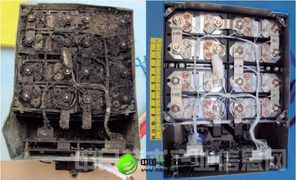 圖1:日航客機發生起火事故 左為從發生起火事故的日航客機中取出的電池模塊。右為正常狀態。 |