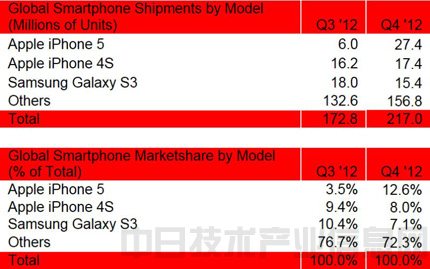 據(jù)Strategy Analytics介紹,2012年第四季度全球智能手機(jī)出貨量為2.17億部。其中iPhone 5占12.6%,iPhone 4S占8%。這兩款終端的出貨量均較上季度有所增加。“iPhone雖然是高價(jià)位終端,卻增加了銷量,表現(xiàn)出了出色的業(yè)績”。