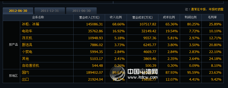 中國電池網-中國電池雜志查詢澳柯瑪上市公司公開披露的年報發現,公司的主營業務是家電和電動自行(汽)車。資料顯示,澳柯瑪是全球知名的制冷裝備供應商,是全球制冷家電、環保電動車和生活家電領先制造商之一,具備年產冷柜300萬臺、冰箱300萬臺、生活家電500萬臺、洗衣機400萬臺、電動車200萬輛、基于互聯網的自動售貨機1萬臺的生產能力,營銷網絡覆蓋全球五大洲100個國家和地區。公司發展重點為制冷家電、生活電器、電動車三大產業項目。