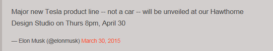 3月31日消息,據(jù)國外媒體報道,特斯拉CEO伊隆·馬斯克(Elon Musk)周一透過其個人Twitter賬號表示,公司將于美國太平洋時間4月30日晚上8點在Hawthorne Design Studio(特斯拉霍桑設(shè)計工作室)為旗下非汽車類全新產(chǎn)品線揭開神秘面紗。