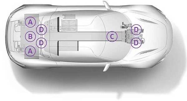 Four electric motor units make up the QUANT e-Sportlimousine’s propulsion system. Alongside the tanks (A), there is the nanoFLOWCELL? (B), which continuously sends electrical energy to the central storage unit.
