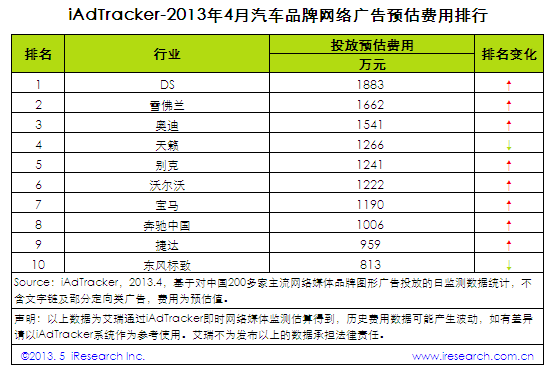 2013年4月,汽車品牌網絡廣告總投放費用達3.7億元。其中,DS投放費用達1883萬元,位居第一;雪佛蘭投放費用達1662萬元,位居第二;奧迪投放費用達1541萬元,位居第三。