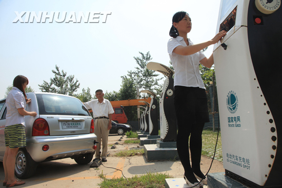 6月15日,山東濱州市市民靳倫杰在濱城區供電公司“加電站”,僅用了十幾分鐘的時間,就為自己的愛車加足了電。劉春迎 攝 新華網山東頻道6月17日電 為服務新能源電動汽車發展,促進清潔能源有效利用。國家電網山東濱州供電公司在城市交通主干道、大型商業區和居民區,安裝電動汽車充電機,讓電
