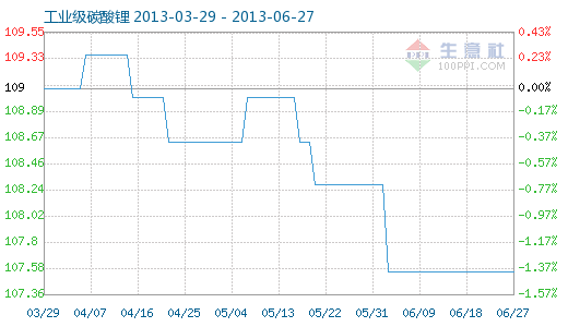 6月27日工業級碳酸鋰商品指數為107.55,與昨日持平,較周期內最高點112.10點(2012-11-04)下降了4.06%,較2012年01月05日最低點98.94點上漲了8.70%。(注:周期指2011-09-01至今) 工業級碳酸鋰商品指數自