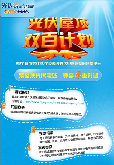 9月1日-30日,中電光伏易將開展“雙百計劃”第一期活動,活動期間定制安裝屋頂光伏電站的業主可尊享4重禮遇: