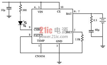 若充電率在0.5~1C之間、電池的溫度在0~45℃之間(室溫充電),則CN3056充電器電路中可省去電池溫度檢測(cè)電路及電池超溫指示電路(引腳TEMP及FAULT端接地),電路如圖1所示。VIN是電源輸入端、CE是使能端,(高電平有效);RISET為充電電流ICH設(shè)定電阻,RISET(Ω)=1800(V)/ICH(A);CHRG為充電狀態(tài)信號(hào)輸出端:充電時(shí)此端為高電平,LED亮;充電結(jié)束時(shí)此端為高阻抗,LED滅;電池未裝入或接觸不良,LED閃亮。