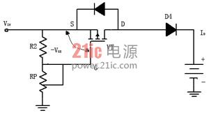 擴(kuò)流部分電路如圖3所示。它由P溝道功率MOSFET(VT)、R及RP組成的分壓器、肖特基二極管D4組成。利用分壓器調(diào)節(jié)P-MOSFET的-VGS大小,使獲得所需擴(kuò)流電流ID.P-MOSFET的輸出特性如圖4所示。在-VGS=2.1V、VDS>0.5V時(shí),其輸出特性幾乎是一水平直線(xiàn);在不同的VDS時(shí),ID是恒流。從圖4也可以看出,在-VGS增加時(shí),ID也相應(yīng)增加。