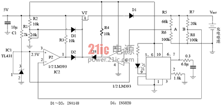 鋰離子電池充電器外接限流型充電電源和P溝道場(chǎng)效應(yīng)管,可以對(duì)單節(jié)鋰離子電池進(jìn)行安全有效的快充,其最大特點(diǎn)是在不使用電感的情況下仍能做到很低的功率耗散,采用8腳μMAX封裝。充電控制精度達(dá)0.75%,可以實(shí)現(xiàn)預(yù)充電,具有過(guò)壓保護(hù)和溫度保護(hù)功能,最長(zhǎng)充電時(shí)間限制為鋰離子電池提供二次保護(hù),鋰離子電池充電器的浮充方式能夠使電池容量充至最大。當(dāng)充電電源和電池在正常的工作溫度范圍內(nèi)時(shí),插入電池將啟動(dòng)一次充電過(guò)程;充電結(jié)束的條件是平均的脈沖充電電流達(dá)到快充電流的1%,或時(shí)間超出片上預(yù)置的充電時(shí)間。鋰離子電池充電器能夠自動(dòng)檢測(cè)充電電源,沒(méi)有電源時(shí)自動(dòng)關(guān)斷以減少電池的漏電。啟動(dòng)快充后打開(kāi)外接的P型場(chǎng)效應(yīng)管,當(dāng)檢測(cè)到電池電壓達(dá)到設(shè)定的門(mén)限時(shí)進(jìn)入脈沖充電方式,P溝道場(chǎng)效應(yīng)管打開(kāi)的時(shí)間會(huì)越來(lái)越短,充電結(jié)束時(shí),LED指示燈將會(huì)按12%的周期閃爍。