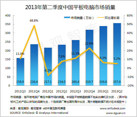 易觀國(guó)際最新監(jiān)測(cè)的數(shù)據(jù)顯示,2013年第二季度中國(guó)平板電腦的銷量達(dá)到了357.6萬(wàn)臺(tái),環(huán)比增長(zhǎng)5.2%。值得注意的是,蘋果頹勢(shì)明顯,且難以抑制其市場(chǎng)份額被蠶食的趨勢(shì)。