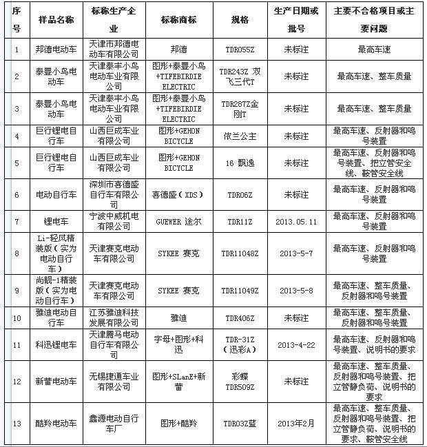 監(jiān)測(cè)結(jié)果顯示,邦德牌TDR055Z、泰豐小鳥牌TDR243Z 雙飛三代T等13個(gè)型號(hào)總體判定為不合格,主要為最高車速、整車質(zhì)量、反射器和鳴號(hào)裝置、說(shuō)明書的要求等項(xiàng)目不符合國(guó)家標(biāo)準(zhǔn)要求。具體名單如下:
