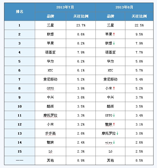 (圖) 2013年8月中國智能手機市場品牌關注比例分布