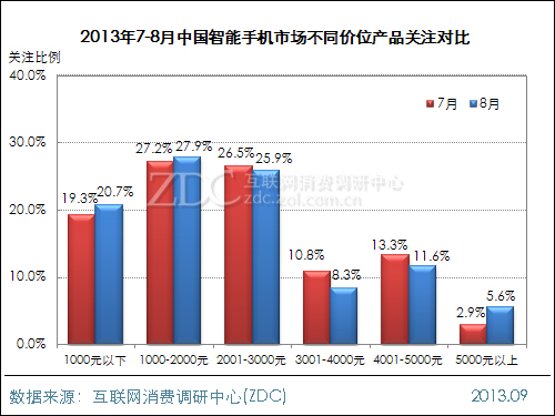(圖) 2013年7-8月中國智能手機市場不同價位產品關注對比