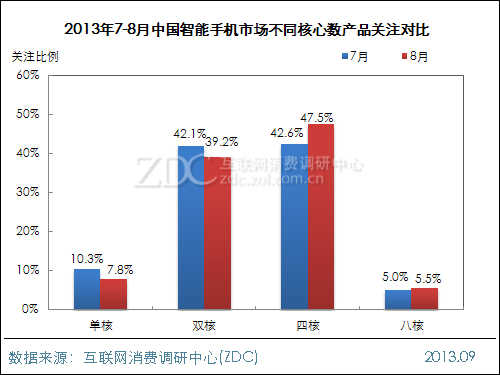 ZDC監測數據顯示,8月智能手機市場上,搭載四核處理器的機型為用戶關注的重點,占據47.5%的關注比例,較上月大幅增長近5個百分點。雙核機型關注度則較上月下降了近3個百分點,降至40%以下。八核機型受價格及產品數量影響,關注度上升緩慢,本月為5.5%,增長0.5%。