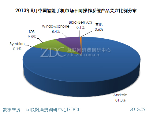 (圖) 2013年8月中國智能手機市場不同操作系統產品關注比例分布