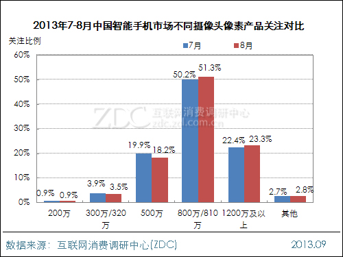 (圖) 2013年7-8月中國智能手機市場不同攝像頭像素產品關注對比