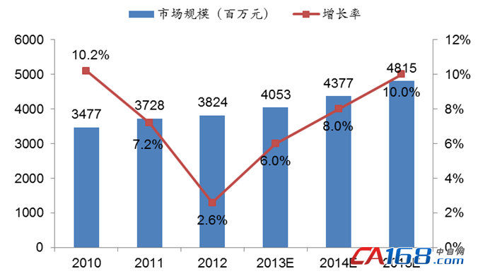 UPS電源市場(chǎng)2012年市場(chǎng)規(guī)模達(dá)到38.24億元,比去年僅增長(zhǎng)2.6%,增長(zhǎng)率延續(xù)去年的態(tài)勢(shì),進(jìn)一步趨緩。主要原因就是全球經(jīng)濟(jì)仍然處于危機(jī)之后的緩慢復(fù)蘇階段,面臨著主權(quán)債務(wù)危機(jī)和財(cái)政懸崖的挑戰(zhàn),世界貿(mào)易的增長(zhǎng)速度明顯下降,國(guó)內(nèi)經(jīng)濟(jì)形勢(shì)呈現(xiàn)“前低后穩(wěn)”的態(tài)勢(shì)。2013年世界經(jīng)濟(jì)與中國(guó)經(jīng)濟(jì)發(fā)展具有諸多不確定性,歐美主權(quán)債務(wù)危機(jī)延續(xù)、中國(guó)經(jīng)濟(jì)增長(zhǎng)放緩、基礎(chǔ)設(shè)施投資與工業(yè)增長(zhǎng)回落、通貨膨脹、人民幣匯率調(diào)整等不確定性因素將長(zhǎng)期存在,需求市場(chǎng)的需求增長(zhǎng)短期V型反轉(zhuǎn)無望。