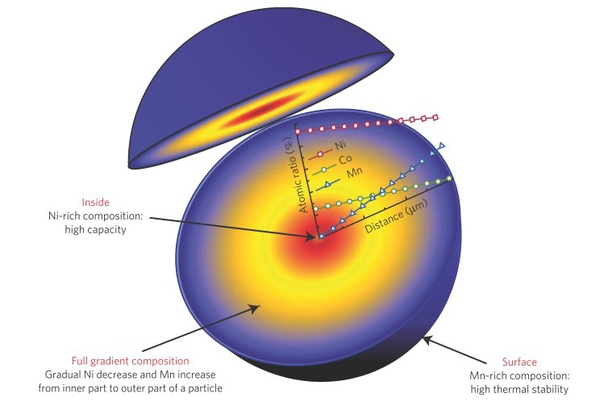 在這種梯度材料中,元素的含量由顆粒中心到外層呈現一種連續的梯度分布,保證了成分的均質。在這篇集合了五行三才之力的杰作中,Sun Yang-Kook發現了一種核心部分的富鎳組成逐步過渡到外殼的富錳組成這么一種復合材料。