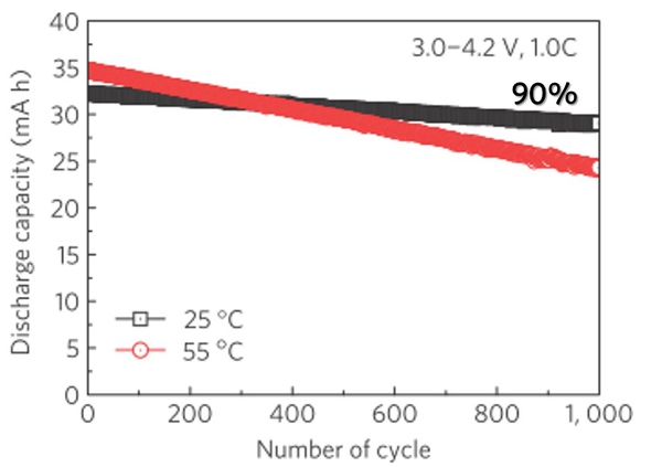 他們還做了全電池測試,用中間相碳微球作為負極,在1C的倍率下循環1000周,常溫下的循環保持率有90%。