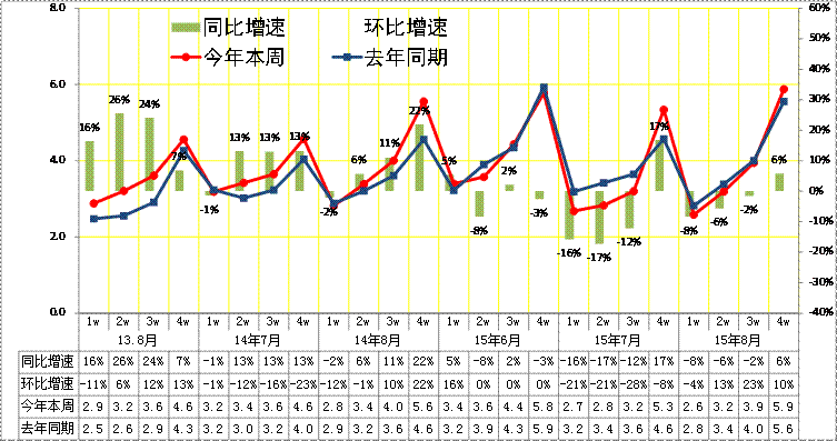 從進度走勢看,15年7月的前兩周的下滑較大,體現了股市的影響較大。8月的走勢已經平穩,處于平穩的低迷狀態。
