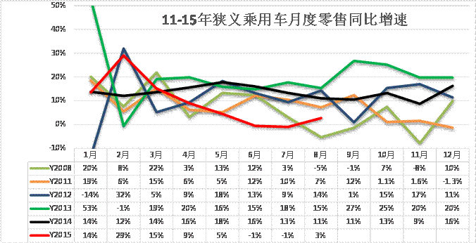 今年實體經濟下行壓力對車市的影響與股市的消費擠壓,兩者共同推動車市增速的加速下行探底的過程。5-8月的國內車市零售增速呈現探底企穩的態勢,近幾個月乘用車市場零售從5月的5%、6-7月的均為-1%,終于8月如我們預期的出現企穩轉正,回升到2%。這似乎體現股市的沖頂回落過程與車市的增速探底過程有一定關聯。