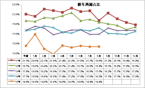 前幾年轎車市場的兩廂車型占比持續下降,14年達到17.7%,15下降到14.6%,其中的8月兩廂車銷售比例下降到14.6%,遠低于同期的18%。這樣的兩廂持續下降趨勢趨勢體現了入門級小車的車身式樣多樣化趨勢。小型MPV類微客的載客需求發展較快,小型SUV也是快速崛起,這都對兩廂轎車的影響也是較大的。