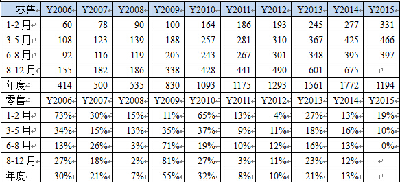 如果根據春節的季節規律,把15年1-2月理解為春節期間,15年的3-5月零售增速是10%,屬于近期增速較低的。6-8月的0%的增速是不可想象的低增速。后面4季度增速一般不低于4%,因此15年走勢是有春節因素的促進的,全年的零售應該不會太差.
