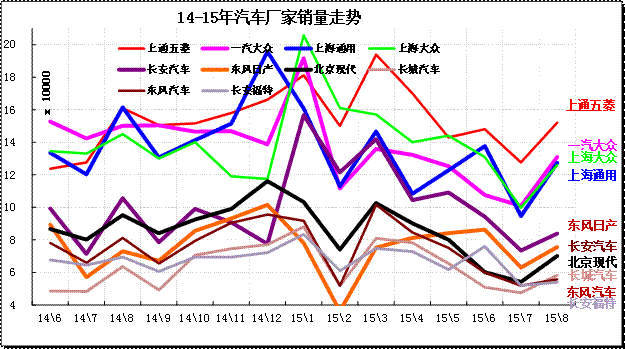廠家表現(xiàn)分化,15年南北大眾和通用三強(qiáng)中都強(qiáng)力降低批發(fā),降低經(jīng)銷商的庫存壓力,因此8月批發(fā)走勢下降。日系沖刺很猛表現(xiàn)突出。長安沖刺較猛,長安福特表現(xiàn)較強(qiáng),長安系總體超常規(guī)增長。