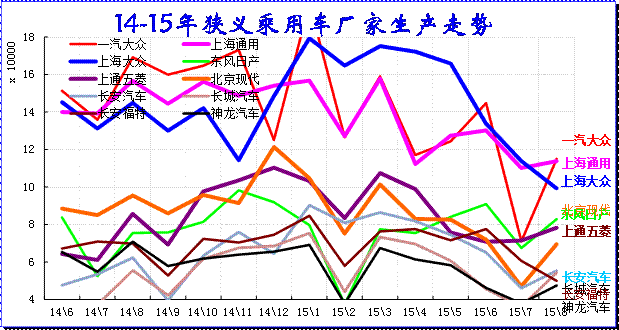 15年8月的廠家產(chǎn)銷競爭仍是較激烈的,走勢差異性大,主力廠家全面回調(diào)。三強(qiáng)的主力廠家的一汽大眾和上海通用的產(chǎn)量調(diào)整較大;日系的生產(chǎn)增量較強(qiáng),形成強(qiáng)力增產(chǎn)增庫存的現(xiàn)象。
