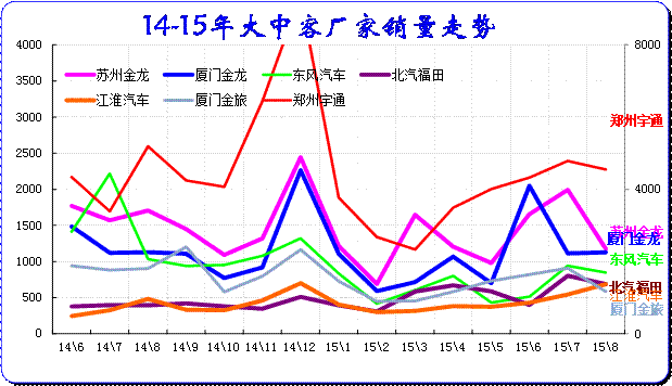 由于新能源補貼和客運需求的促進(jìn),15年6月的大客的市場表現(xiàn)較強(qiáng),8月延續(xù)走強(qiáng)態(tài)勢,宇通和金龍等主力企業(yè)走勢很好。