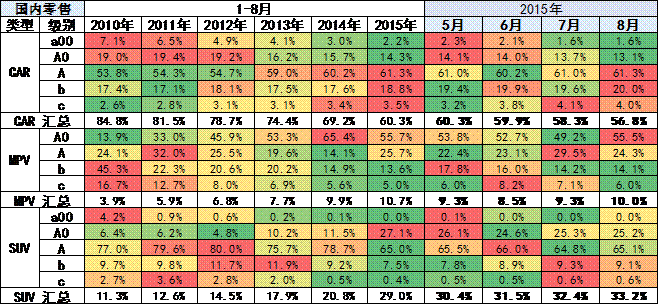此表用體現(xiàn)的是每一個細(xì)分類別占上一層級總零售量的比重,與包含出口和庫存變化的批發(fā)增長有所差異。15年8月的市場體現(xiàn)SUV走強(qiáng)趨勢特征明顯,轎車市場的地位處于江河日下的狀態(tài),轎車中的中高級別走勢較好,低端受到分流影響較大。多功能車市場超強(qiáng)增長,其中近年MPV是中低端需求也有下降,A0級MPV表現(xiàn)逐步走弱,逐步推移到A級MPV。但本月的B級以上MPV車型表現(xiàn)較好,中低端有所調(diào)整。