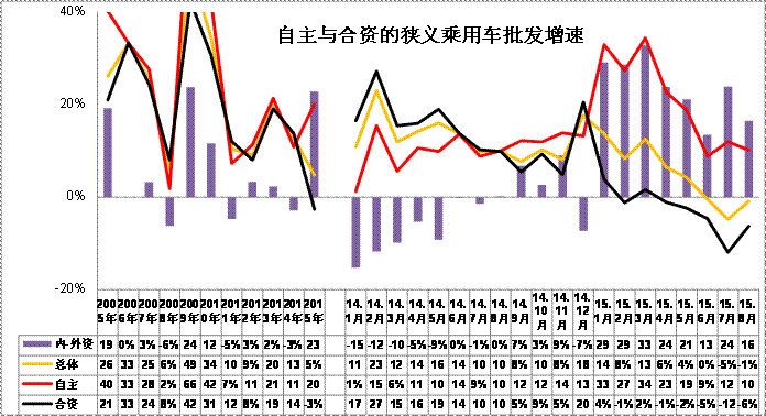 13年的自主增速21%,稍快于合資企業(yè)的增速2個百分點,14年年自主增速11%,低于于合資增速3個百分點,15年1-8月的形勢翻轉(zhuǎn),自主高于合資增速26個百分點。14年的1-8月的自主增速落后合資較多,這也是15年初的自主品牌增速高的較好基礎(chǔ),自主因此表現(xiàn)突出。