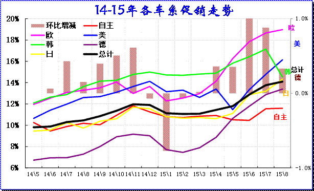 此表測算的促銷價格是上市3個月后的主銷車型的促銷幅度跟蹤。今年4-8月價格促銷出現(xiàn)大幅上升,相對14年4-8月的促銷加大力度更大。而14年8月后的促銷增長不大,今年3月的降價帶來4-8月競品促銷明顯增大,尤其是8月的促銷增長超強(qiáng)。15年的各車系價格促銷走勢稍有差異,自主品牌促銷平穩(wěn),美系降價提升表現(xiàn)。而歐系、德系的促銷增大很猛。韓系的8月降價SUV力度較大。