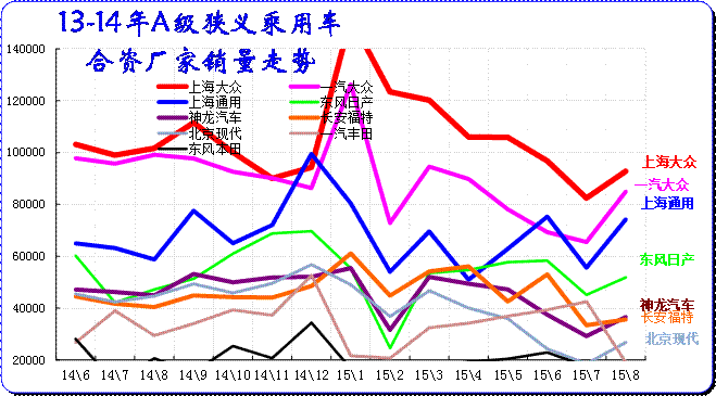 A 級(jí)車是合資企業(yè)超強(qiáng)的主力細(xì)分市場(chǎng),主力廠家在此堆積較大銷量,南北大眾和通用的表現(xiàn)超強(qiáng)。南北大眾15年開門紅,但總體看合資A級(jí)車增長(zhǎng)嚴(yán)重乏力。南北大眾15年走勢(shì)仍是合資品牌中最強(qiáng)的,但近幾個(gè)月的下滑幅度也是最大的。通用開始調(diào)整,新組合效果逐步提升銷量。現(xiàn)實(shí)看南北大眾和通用的A級(jí)車銷量分化。長(zhǎng)安福特和神龍的A級(jí)車走弱明顯。日系的A級(jí)車開始走強(qiáng)的趨勢(shì),一汽豐田尤為突出,8月稍有異常。韓系有明顯走弱趨勢(shì)。
