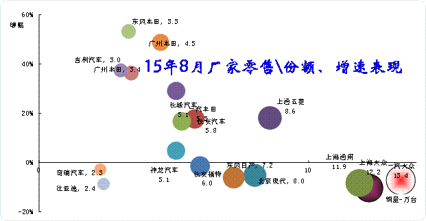 15年8月的主力廠家表現與14年反差巨大,上海通用、一汽大眾、長安福特、神龍等前期表現較好的企業出現弱化趨勢。而豐田、本田出現異常的高增長現象,自主車企普遍表現較強。
