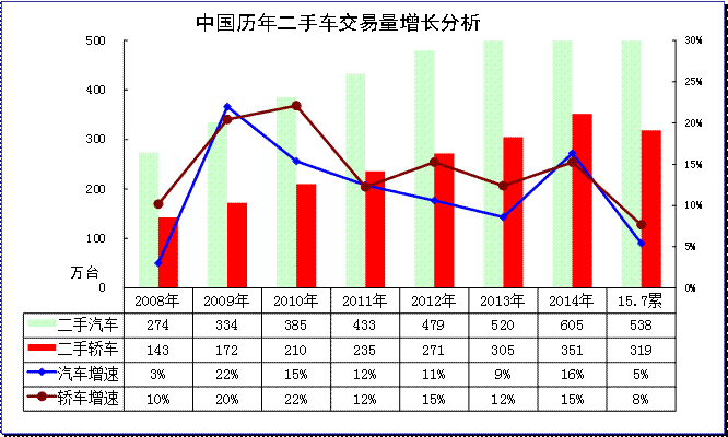 根據中國汽車流通協會數據,2015年1-7月全國二手車市場累計交易量537.95 萬輛,相比上年同期增長5.42%,累計交易額3159.76億元,相比上年同期上漲0.64% ;其中,7月當月交易量為77.05萬輛,環比增長1.34%,月度同比增長3.43%;7月當月交易額為461.68億元,環比增長3.14%。