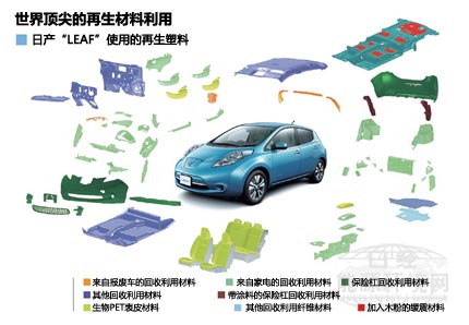 日產(chǎn)汽車2010年12月上市的純電動(dòng)汽車“LEAF”(聆風(fēng))與該公司的其他汽車相比,使用了大量的回收利用材料。其中包括利用廢舊保險(xiǎn)杠再生的保險(xiǎn)杠、利用PET瓶再生的纖維及利用回收塑料制成的內(nèi)飾材料等。
